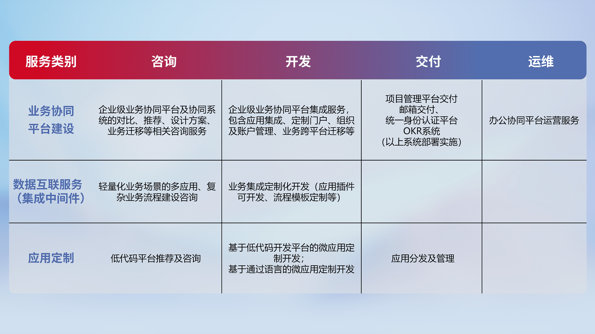 针对钉钉、、企微、、IDaas等平台级产品提供产品的规划、、、方案、、、、交付、、定制化开发等服务,,,实现如统一协同办公、、、、智能客户服务、、、混合会议管理、、智能数据查询、、、等业务场景,,,,实现数字化转型。。。