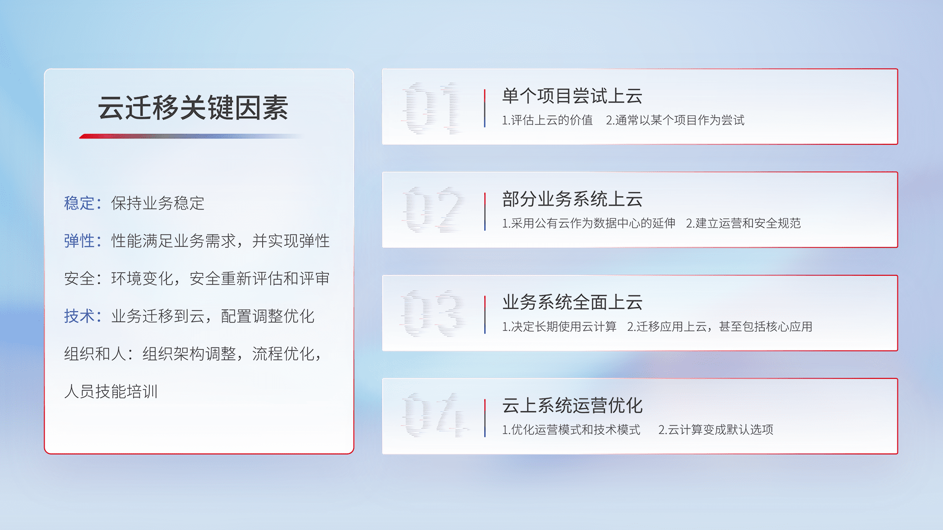 结合实际业务,,,,从规划设计、、、、云平台选型、、、、云原生改造、、、、数据迁移、、集成交付,,,,迁移全过程为客户识别最佳上云路径,,做好风险识别管理,,,,设计网络架构、、、、身份权限、、安全审计合规、、操作审计、、、日志审计、、监控告警策略、、、多站点容灾设计等,,,对云上基础设施进行整体规划,,,,提升IT治理水平,,以满足弹性、、、高可用、、、高性能的需求。。。