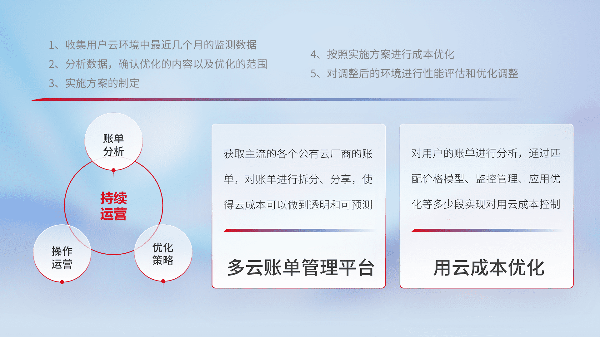 通过多云纳管,,以统一的资源数据模型把客户的云资源进行抽象和封装,,,,进而实现对多云资源的统一操作,,保障云资源管理的可靠性、、、稳定性与可用性。。。。量身定制化运维内容,,配置、、开发运维、、补丁管理、、、备份、、监控、、认证和访问管理、、审计和日常巡检等,,保障在用云过程中的可靠度,,,,稳定度以及高可用率。。。