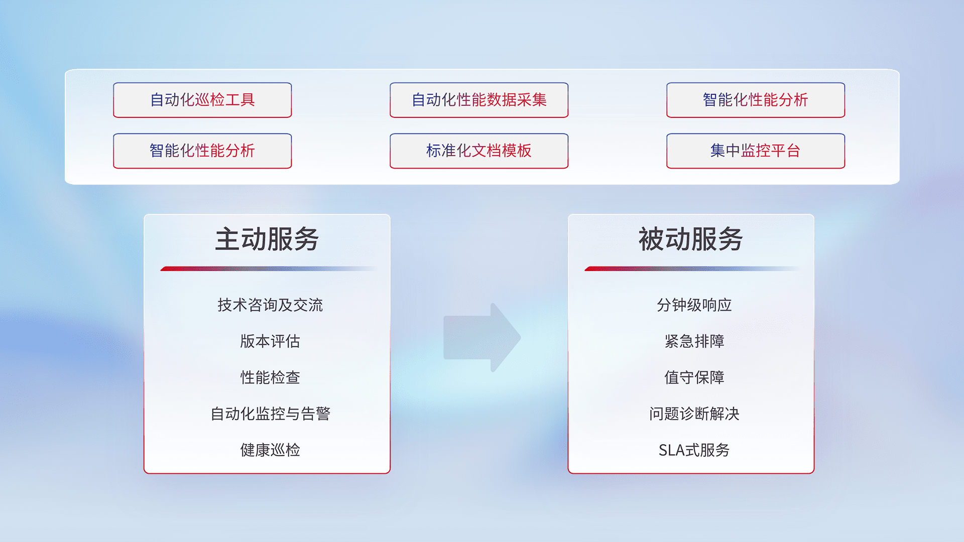 智能化工具和标准化文档,,,,保障服务质量,,提供主动服务(包含技术咨询、、、版本评估、、、、性能检查、、、、自动化监控与告警、、、健康巡检)和被动服务包含(分钟级响应、、、紧急排障、、、值守保障、、问题诊断解决、、、SLA服务)。。。